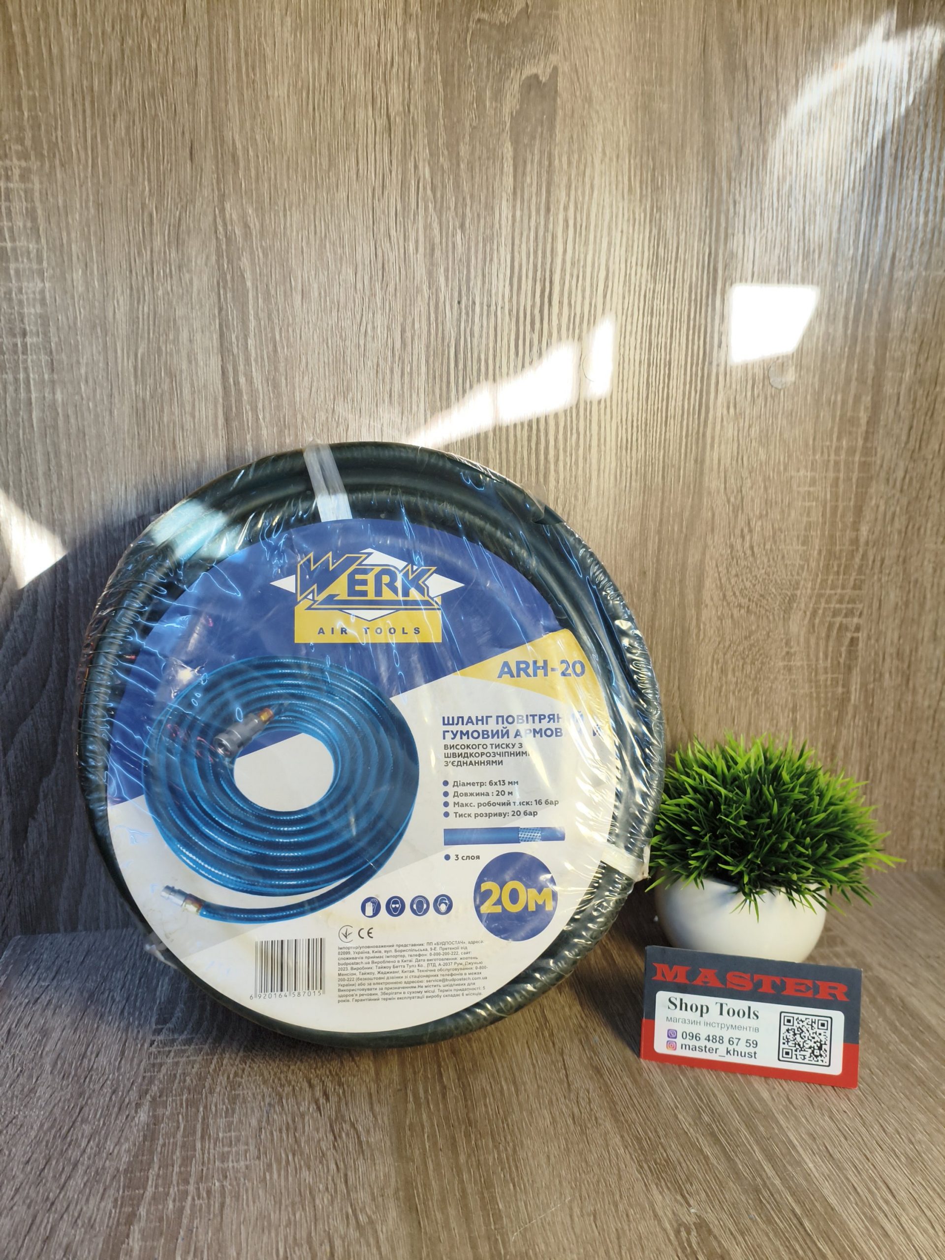 Опис Werk ARH-20 Шланг Повітряний армований шланг високого тиску, який відповідає за безперебійну роботу пневматичних інструментів підключених до компресорного обладнання. Завдяки великій довжині в 20 м, пропонований шланг може використовуватися в різних галузях промисловості: на станціях техобслуговування, в ремонтних майстернях, гаражних і складських приміщеннях. Шланг складається з міцного гумового матеріалу, що гарантує його міцність і довговічність у використанні. Внутрішній діаметр становить 6 мм, зовнішній – 13 мм. Напруга, яке він здатний витримати без розриву – 16 бар. Крім цього, виріб демонструє високу температурну стабільність. При використанні в умовах низьких температур він зберігає прекрасну гнучкість і не втрачає своєї міцності при попаданні прямих сонячних променів. У комплект разом зі шлангом також входить два коннектора для простого і швидкого підключення.